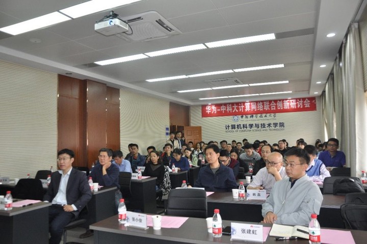 此次研讨会由许胤龙教授主持,计算机学院副院长陈恩红教授、网络信息中心主任李京教授、信息学院洪佩琳教授、计算机学院副院长孙广中副教授、华为网络技术实验室主任张小俊、华为中央研究院技术合作部部长张建虹、华为网络技术实验室首席技术专家李宗鹏,华为网络技术实验室副主任韩磊、计算机学院和信息学院的部分师生、华为网络技术实验室的多名专家参加了这次联合创新研讨会。