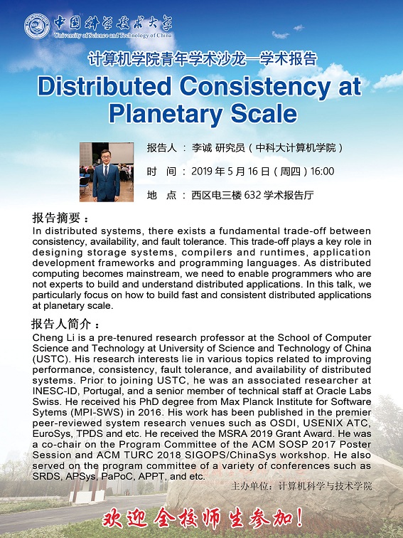 5月16日下午,实验室李诚老师在计算机学院青年学术沙龙上进行了一场题为”Distributed Consistency at Planetary Scale”的学术报告。在报告上李诚老师为同学们清晰解释了分布式系统、分布式系统一致性等相关概念及其重要性与挑战,并详细阐述了自己在分布式一致性方面近期的科研方向与成果,为同学们带来了一场丰富又充实的学术报告。